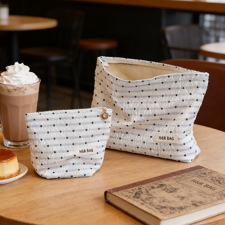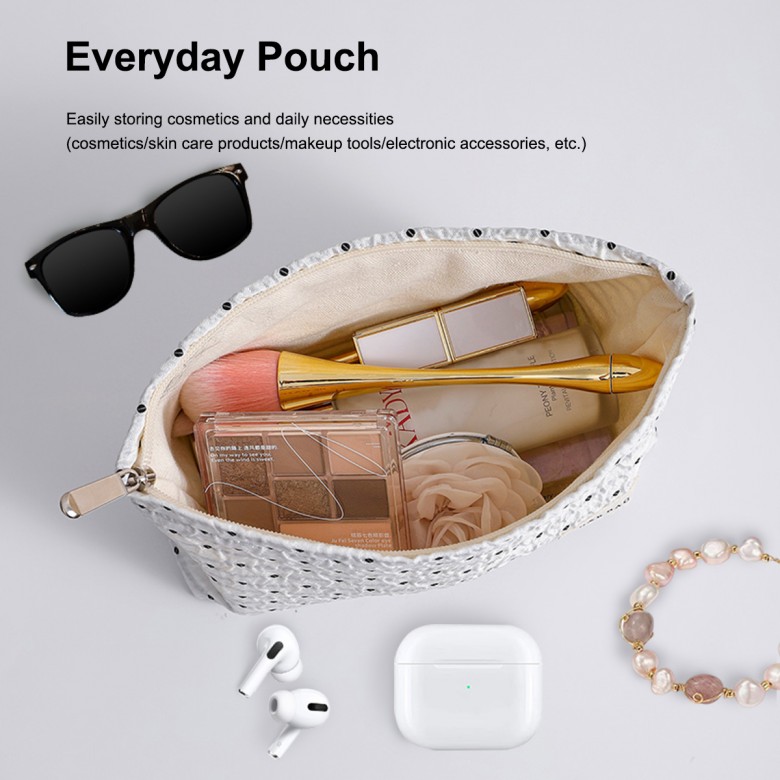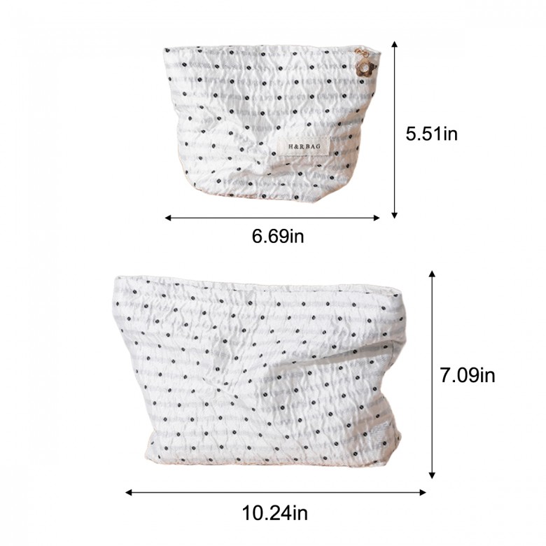 The black polka dot makeup pouch blends modern simplicity with practical daily storage, bringing lightness and sophistication to your everyday routine and travel. The clean white base paired with classic black polka dots creates a timeless and effortlessly chic aesthetic, making it the perfect match for any outfit or occasion. The exterior is crafted from refined jacquard woven fabric, with textured pleats interwoven with the polka dot pattern for a simple yet detailed design. Inside, the beige pure cotton canvas lining is durable, wrinkle-resistant, and skin-friendly, ensuring comfort and longevity with every use. The large pouch holds beauty products under 200ml, skincare essentials, portable chargers, and small electronics. The small pouch is ideal for lipsticks, eye shadows, earphones, or 5 to 6 sanitary pads. Whether used as a handheld accessory or tucked into a tote bag, backpack, or suitcase, this pouch provides a precise, convenient storage solution. More than just a storage tool, this makeup pouch brings comfort, ease, and delight to your everyday life, making each use a satisfying and effortless experience.