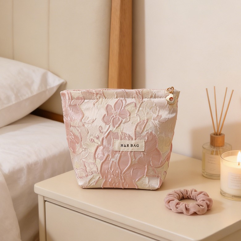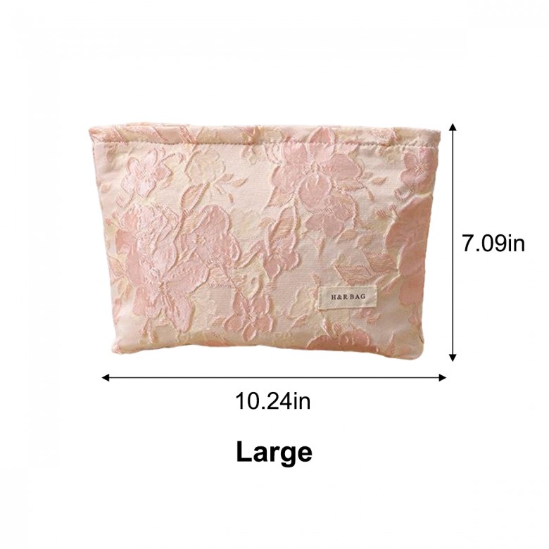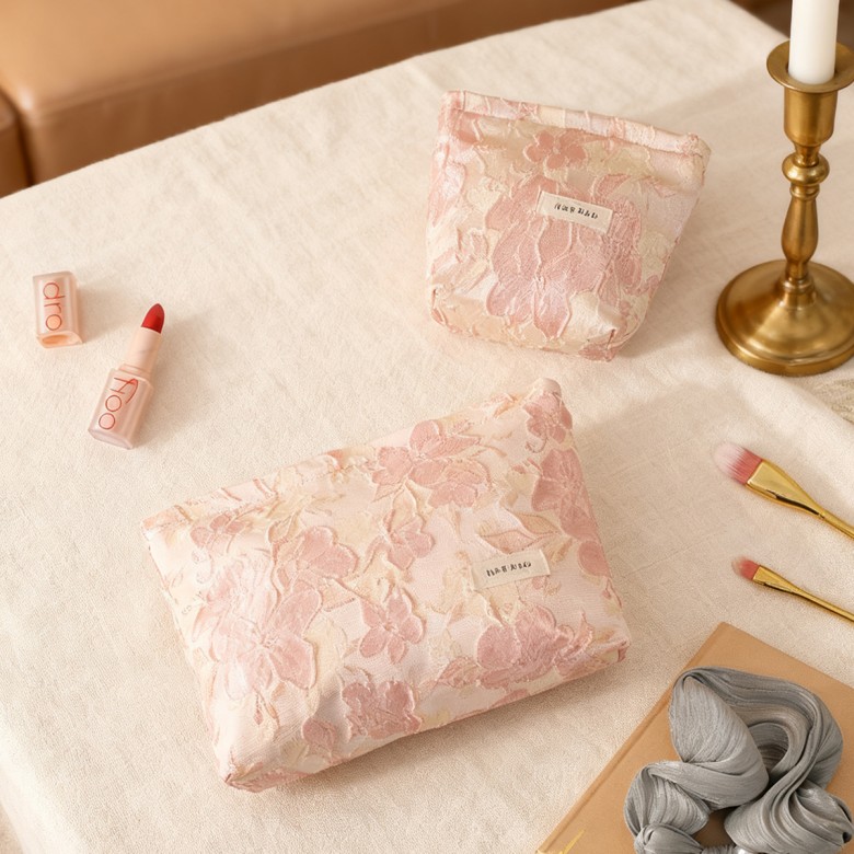 The embossed pink floral makeup pouch brings soft French-inspired elegance into your everyday storage, adding a sense of grace and calm to both daily routines and travel moments. Set against an ivory base, the delicate raised floral patterns appear vivid and dimensional, creating a timeless and refined aesthetic. More than just a makeup pouch, it serves as a gentle accessory,infused with romantic details that bring quiet elegance and comfort to a busy life. The exterior is crafted from exquisite embossed jacquard fabric, offering a soft yet textured tactile experience. Inside, the pouch is lined with beige pure cotton canvas that is durable and skin-friendly. The large pouch comfortably stores beauty and skincare essentials, as well as small digital accessories under 200ml, while the small pouch is ideal for storing lipsticks, eye shadows, earphones, or 5 to 6 sanitary pads, keeping everything organized. Whether carried by hand or placed into a tote bag, backpack, or suitcase, it fits seamlessly into daily life and travel. You can choose individual sizes or opt for a combination of both large and small pouches, offering flexible storage solutions that help keep your life organized with effortless elegance.