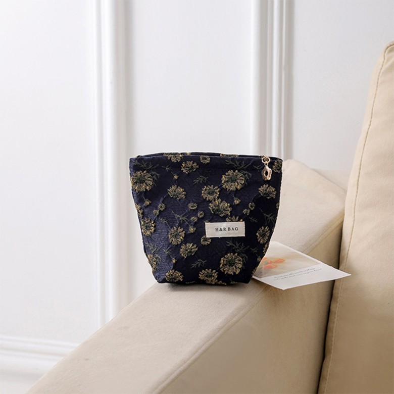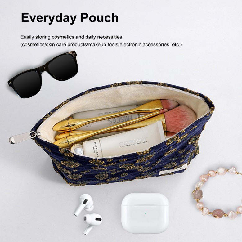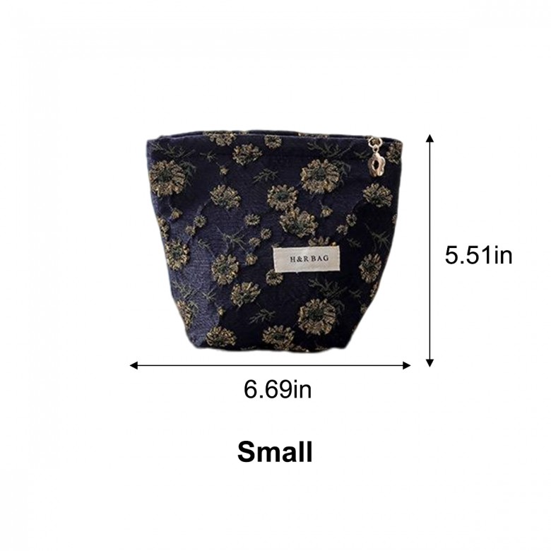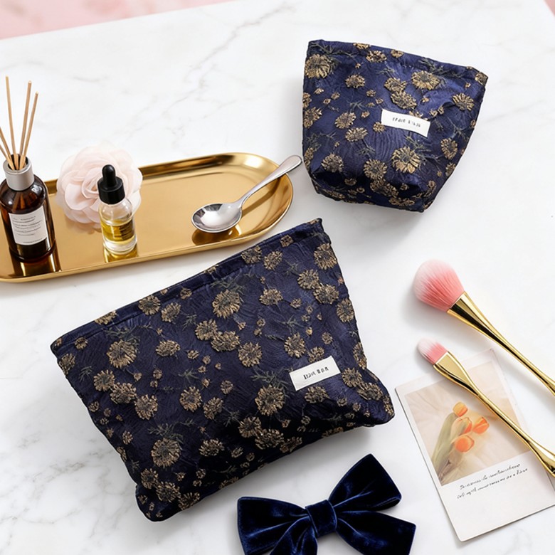 The gold daisy cosmetic pouch features delicate gold-embroidered daisy patterns set against a rich navy base, combining elegance with vintage charm. The exterior is crafted from exquisite jacquard woven fabric, offering a soft and refined touch while remaining durable for everyday use. The interior is lined with 12oz pure cotton canvas, providing a skin-friendly, wear-resistant structure designed for repeated daily use. The dual-pouch design allows you to store essentials with ease. The large pouch comfortably holds beauty products under 200ml, including lotions, cleansers, makeup brushes, and portable chargers, ideal for daily commuting or travel. The small pouch is perfect for storing lipsticks, eye shadows, earphones, or 5 to 6 sanitary pads, allowing small essentials to stay tidy and easy to access. Whether carried by hand or placed in a tote, backpack, or suitcase, it remains compact and space-efficient. This pouch is not just a practical storage solution, it is a small accessory full of character and warmth. As a gift for a mother, daughter, or close friend, it conveys thoughtful care, comfort, and timeless elegance.