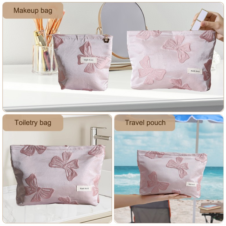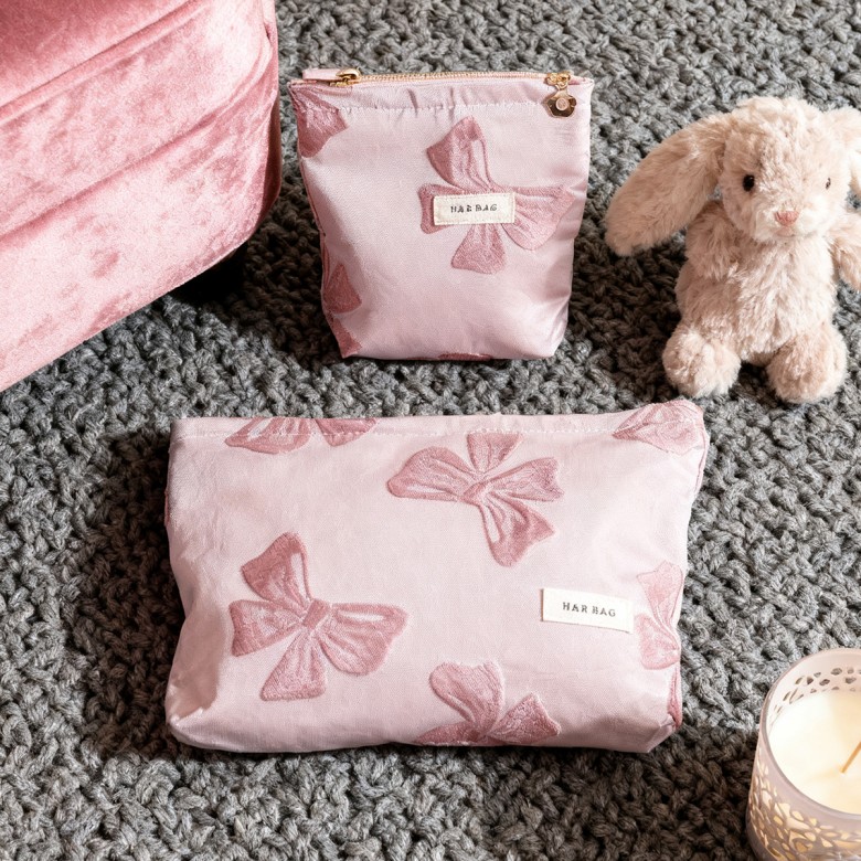 The pink bow makeup pouch features a soft pink base paired with dimensional bow patterns, effortlessly blending gentle sweetness with a timeless vintage charm. The exterior is crafted from exquisite jacquard fabric, with a layered bow design that adds depth and texture. The interior is lined with 12oz pure cotton canvas, ensuring a skin-friendly, durable, and long-lasting finish. This thoughtfully designed pouch set brings a touch of joy to your daily routine. The larger pouch comfortably fits skincare items under 200ml, such as lotions, cleansers, makeup brushes, or a portable power bank. The smaller pouch is perfect for carrying lipsticks, eye shadows, earphones, or 5 to 6 sanitary pads, keeping your personal essentials neatly arranged and easy to access. Whether carried by hand or tucked into a tote bag, backpack, or suitcase, it doesn’t take up space and is perfect for organizing your vanity. More than just a makeup pouch, it’s a small companion in your everyday life, bringing a little joy to your day. As a gift, it expresses warmth and care, making it the perfect present for mom, daughter, friends, or a well-deserved treat for yourself.