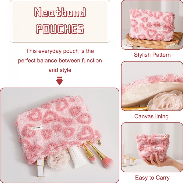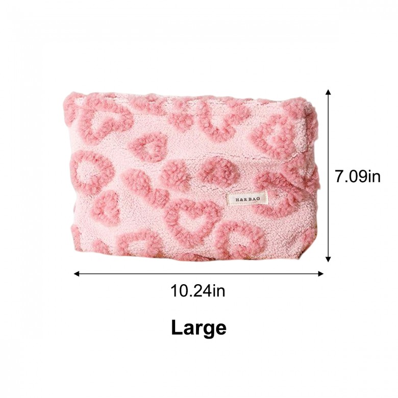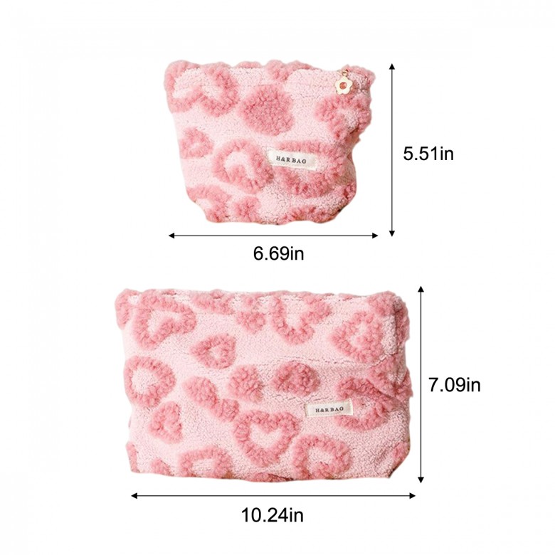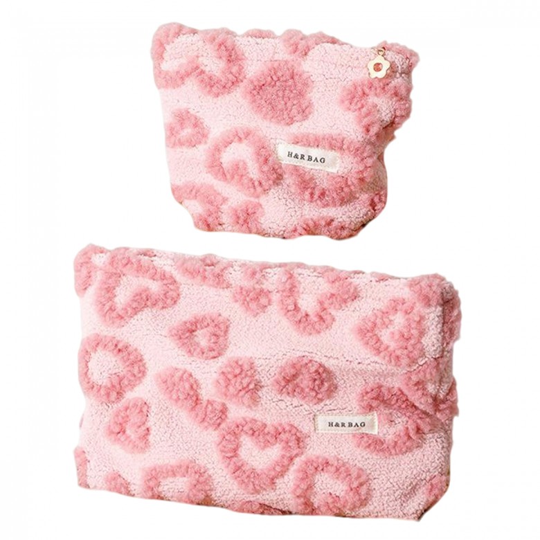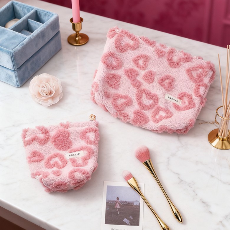 The pink plush heart cosmetic pouch features dimensional plush heart details paired with a soft pink base, blending sweet, playful charm naturally into everyday organization. The exterior is crafted from delicate, fluffy plush jacquard fabric, with heart patterns that feel full and soft to the touch while maintaining their shape. The interior is lined with 12oz beige pure cotton canvas, offering a skin-friendly, wrinkle-resistant, and durable finish for long-term daily use. With its practical dual-pouch design, the large pouch easily accommodates beauty products under 200ml, including skincare, cosmetics, toiletries, or digital items such as phones and power banks. The small pouch is ideal for organizing smaller items like lipsticks, coins, keys, cards, earphones, or 5 to 6 sanitary pads. Whether carried by hand, placed inside a tote bag, crossbody, backpack, or tucked into a suitcase,it is compact and space-saving. More than just a cosmetic pouch, it's a little piece of happiness that accompanies your everyday life. Each use adds warmth and joy. This cosmetic pouch is the sweet gift for mothers, daughters, or friends, delivering care and love in a delicate and heartfelt way.