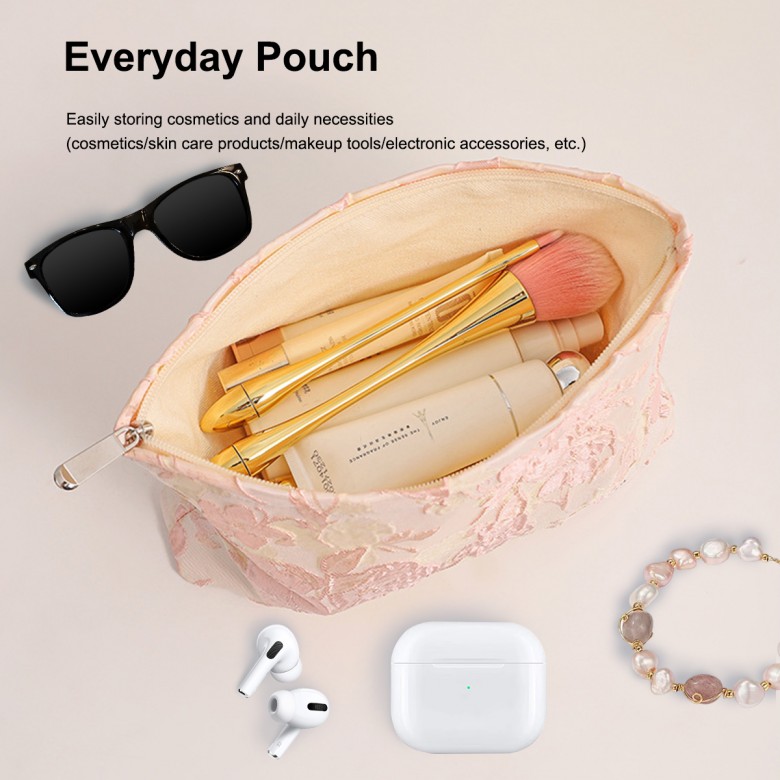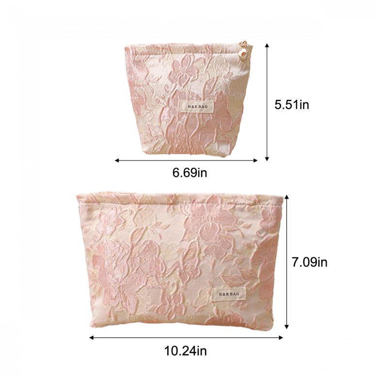 The embossed pink floral makeup pouch brings soft French-inspired elegance into your everyday storage, adding a sense of grace and calm to both daily routines and travel moments. Set against an ivory base, the delicate raised floral patterns appear vivid and dimensional, creating a timeless and refined aesthetic. More than just a makeup pouch, it serves as a gentle accessory,infused with romantic details that bring quiet elegance and comfort to a busy life. The exterior is crafted from exquisite embossed jacquard fabric, offering a soft yet textured tactile experience. Inside, the pouch is lined with beige pure cotton canvas that is durable and skin-friendly. The large pouch comfortably stores beauty and skincare essentials, as well as small digital accessories under 200ml, while the small pouch is ideal for storing lipsticks, eye shadows, earphones, or 5 to 6 sanitary pads, keeping everything organized. Whether carried by hand or placed into a tote bag, backpack, or suitcase, it fits seamlessly into daily life and travel. You can choose individual sizes or opt for a combination of both large and small pouches, offering flexible storage solutions that help keep your life organized with effortless elegance.