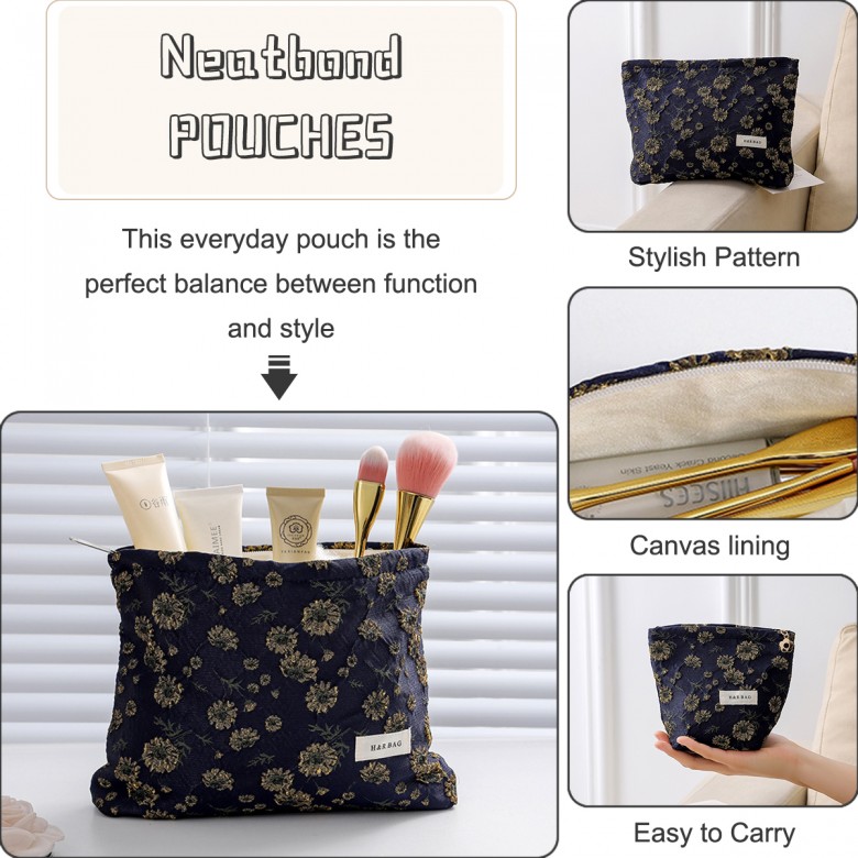 The gold daisy cosmetic pouch features delicate gold-embroidered daisy patterns set against a rich navy base, combining elegance with vintage charm. The exterior is crafted from exquisite jacquard woven fabric, offering a soft and refined touch while remaining durable for everyday use. The interior is lined with 12oz pure cotton canvas, providing a skin-friendly, wear-resistant structure designed for repeated daily use. The dual-pouch design allows you to store essentials with ease. The large pouch comfortably holds beauty products under 200ml, including lotions, cleansers, makeup brushes, and portable chargers, ideal for daily commuting or travel. The small pouch is perfect for storing lipsticks, eye shadows, earphones, or 5 to 6 sanitary pads, allowing small essentials to stay tidy and easy to access. Whether carried by hand or placed in a tote, backpack, or suitcase, it remains compact and space-efficient. This pouch is not just a practical storage solution, it is a small accessory full of character and warmth. As a gift for a mother, daughter, or close friend, it conveys thoughtful care, comfort, and timeless elegance.