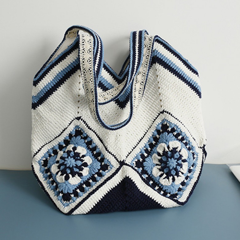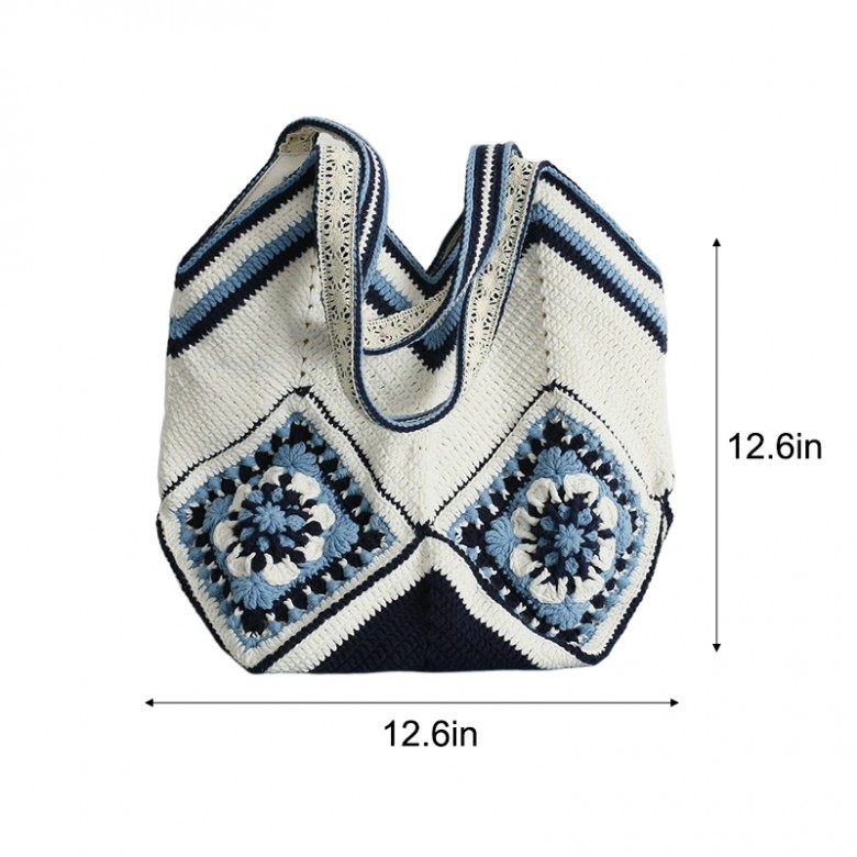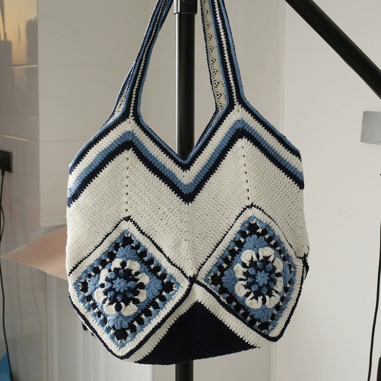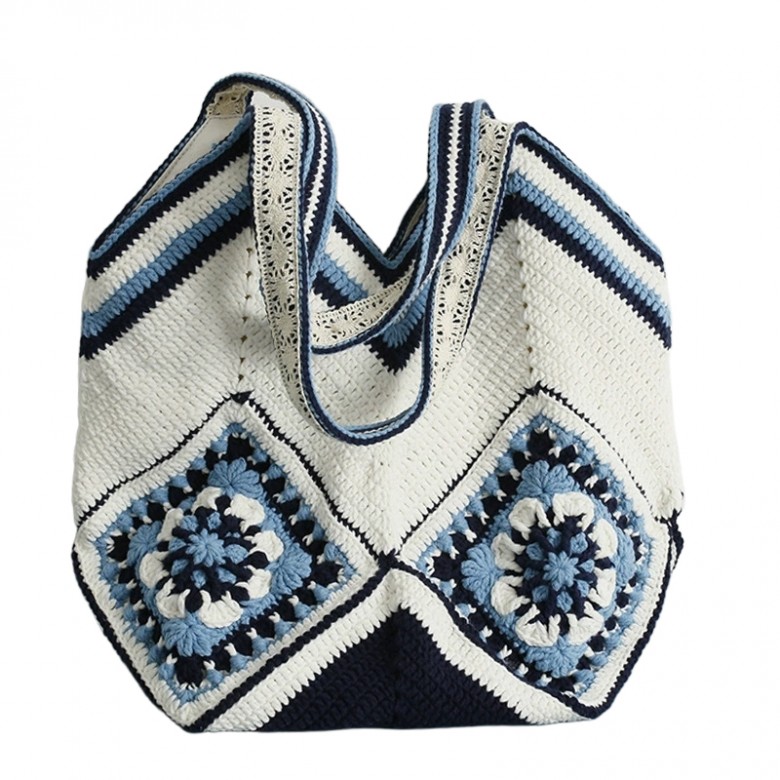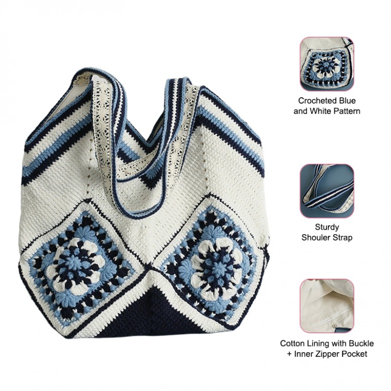 ·Handmade granny square design paired with blue-and-white tones for a stylish artistic look.