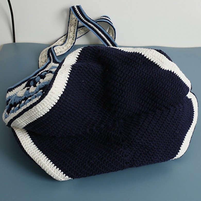 The handmade crochet white and blue shoulder tote bag seamlessly blends traditional craftsmanship with Eastern aesthetics. Crafted from high-quality yarn, this bag is both thick and durable, while still soft to the touch. Its classic granny square design, combined with a fresh blue-and-white color palette, embodies vintage charm and a cozy, textured feel. Each stitch reflects the artisan's care and expertise, making every bag a unique piece of art. With ample space, this bag comfortably holds all your daily essentials, from a notebook and wallet to cosmetics and small personal items. The interior features a zippered pocket for organized storage. The wide lace-stitched shoulder straps ensure a comfortable carrying experience, even for long periods, while adding an elegant touch to the design. Whether you're commuting, shopping, or on a short trip, this tote adds an artisanal flair to any outfit. More than just a functional accessory, it represents a refined lifestyle, offering calm and elegance amidst the hustle and bustle of daily life.