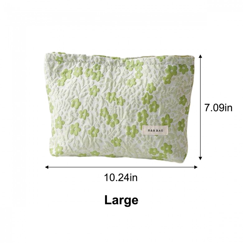 The light green floral makeup pouch effortlessly blends nature-inspired charm with practical storage solutions, bringing a touch of serenity to your daily routine and travels. The ivory base features light green 3D floral patterns, evoking a fresh forest breeze. Each glance brings a soft, refreshing touch to your day. The exterior’s textured floral design provides both visual appeal and a luxurious tactile experience, while the beige pure cotton canvas lining ensures durability, wrinkle resistance, and reliable protection over time. The large pouch easily accommodates travel essentials under 200ml, such as lotions, cleansers, power banks, and makeup brushes, while the small pouch is ideal for lipsticks, eye shadows, earphones, or 5 to 6 sanitary pads. Whether carried by hand or placed in a tote bag, backpack, or suitcase, this pouch maximizes space without creating bulk, keeping your items organized and easily accessible. Choose between individual sizes or opt for the duo set for a more flexible approach to storage. More than just a storage solution, this pouch offers a natural, refreshing lifestyle, providing a gentle reminder to embrace a bit of softness and warmth amidst the hustle of everyday life.