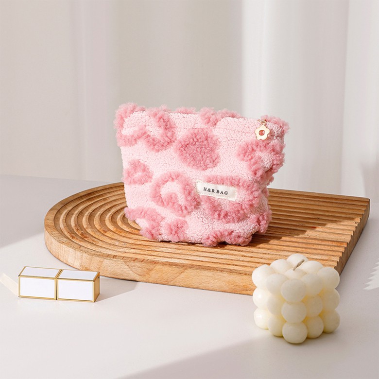 The pink plush heart cosmetic pouch features dimensional plush heart details paired with a soft pink base, blending sweet, playful charm naturally into everyday organization. The exterior is crafted from delicate, fluffy plush jacquard fabric, with heart patterns that feel full and soft to the touch while maintaining their shape. The interior is lined with 12oz beige pure cotton canvas, offering a skin-friendly, wrinkle-resistant, and durable finish for long-term daily use. With its practical dual-pouch design, the large pouch easily accommodates beauty products under 200ml, including skincare, cosmetics, toiletries, or digital items such as phones and power banks. The small pouch is ideal for organizing smaller items like lipsticks, coins, keys, cards, earphones, or 5 to 6 sanitary pads. Whether carried by hand, placed inside a tote bag, crossbody, backpack, or tucked into a suitcase,it is compact and space-saving. More than just a cosmetic pouch, it's a little piece of happiness that accompanies your everyday life. Each use adds warmth and joy. This cosmetic pouch is the sweet gift for mothers, daughters, or friends, delivering care and love in a delicate and heartfelt way.